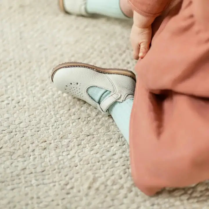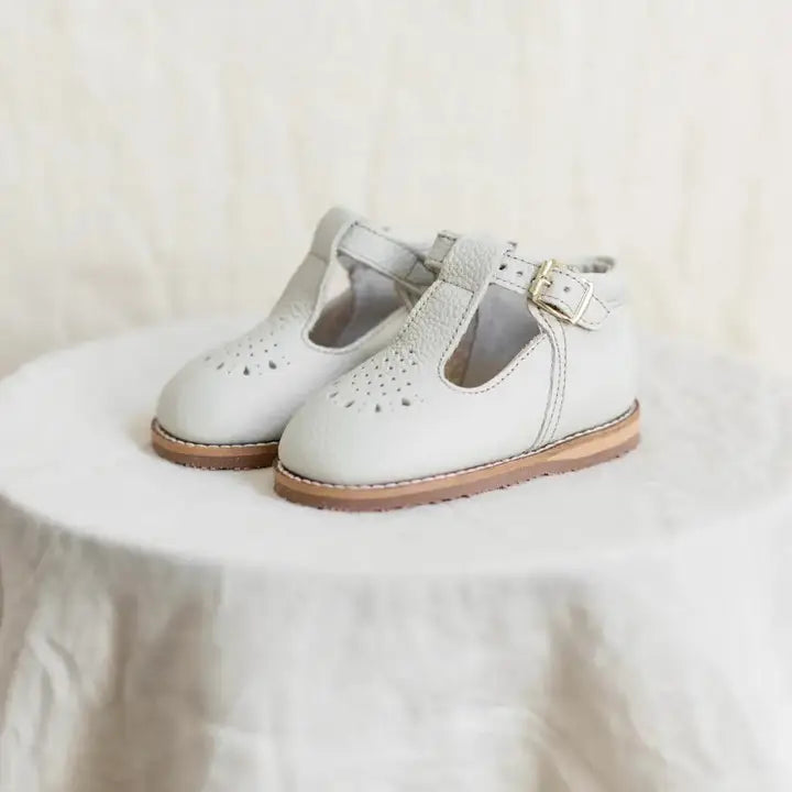 The Greta T-Strap in Fog is made of soft leather upper and lined in breathable leather which wicks away moisture. The structure of the shoe and the flexible rubber sole provide stability without weight to support your little one's early steps. We added an adorable teardrop perforation across the toe and a padded collar around the ankle. Perfect for everyday wear or special occasions.
