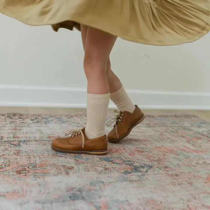 The Rory Boat Shoe in Cognac is made of a genuine leather and lined in breathable leather which wicks away moisture. The structure of the shoe and the flexible rubber sole provide stability without weight to support your little one's early steps.