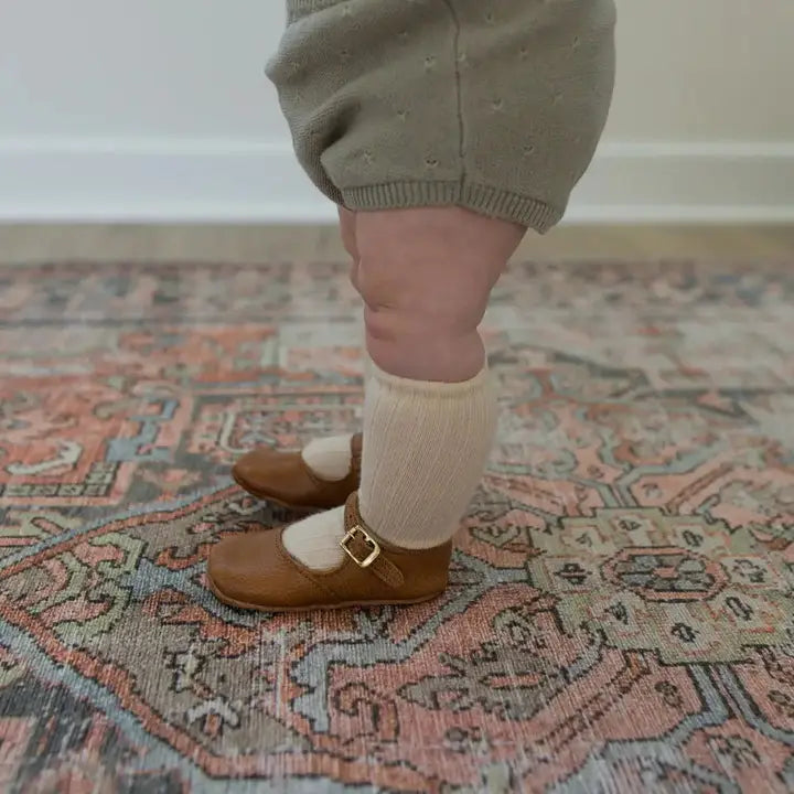 The Cognac Soft Soled Mary Jane is made of soft leather and features an adjustable ankle strap. Our soft soled shoes are non-restrictive and perfect for infants who aren’t quite walking yet.